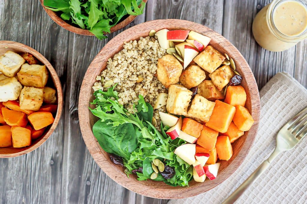 - 1. The tofu and sweet potato can be cooked on the same baking sheet (if large enough), but arrange them separately and be careful to remove each ingredient when done, as they may have different bake times.