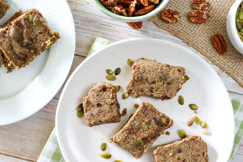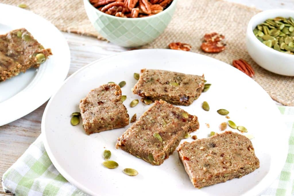 - 1. In a food processor, combine pecans, dates, ¾ cup pumpkin seeds, ¼ cup currants, vanilla, pumpkin pie spice mix, and salt.