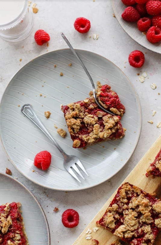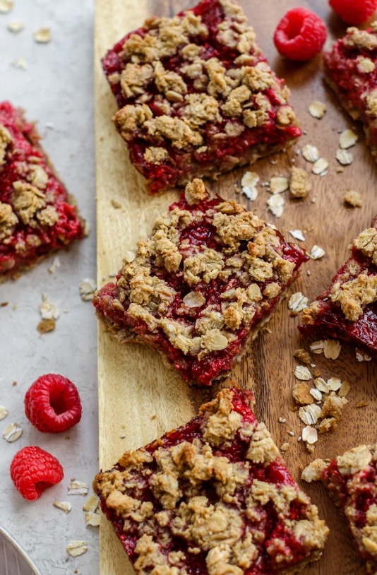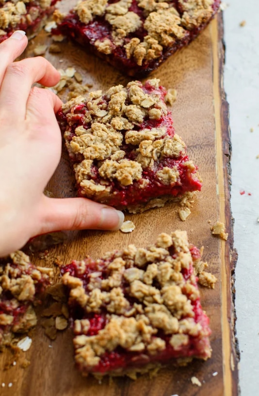 - 4. Press ⅔ of the mixed “dough” into the bottom of the prepared pan. Pour the gelled raspberry sauce over the base layer. Finally, use your hands to crumble the remaining dough and sprinkle it over the top.