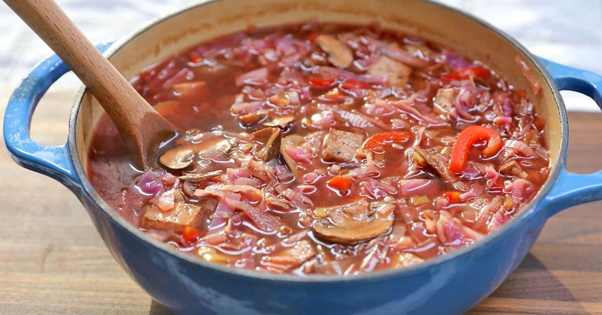 - 1. In a large saucepan, sauté cabbage, onions, and garlic in vegetable broth over medium-high heat, until onions brown.