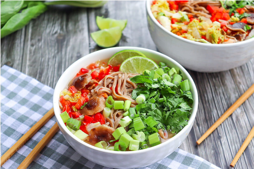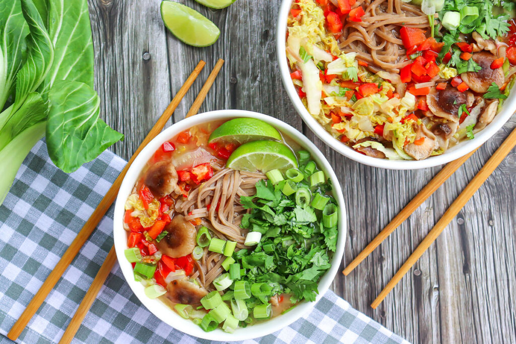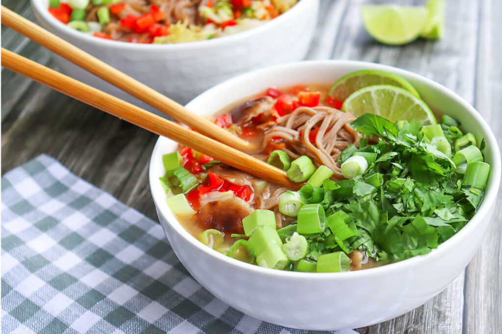 - 4. Add the basil or cilantro, green onions, and cooked noodles to the stockpot. Simmer for 5 minutes to marry the flavors.