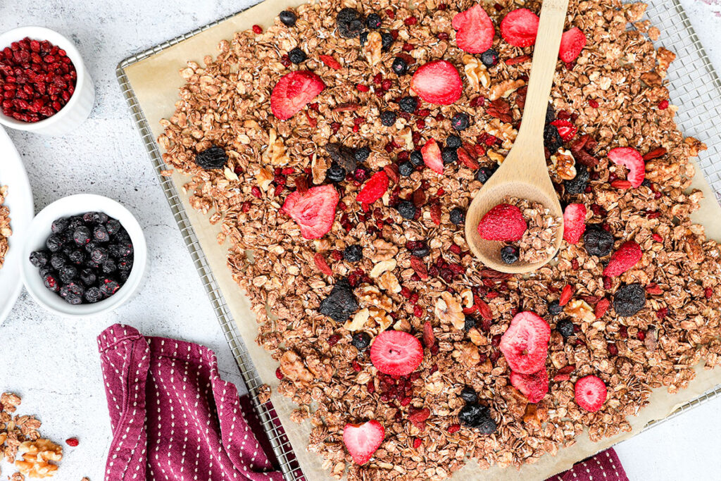 - 8. Add the granola to a bowl and mix in the freeze dried fruit.