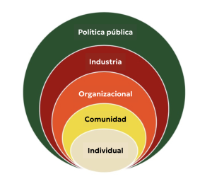 Con este concepto en mente, ampliemos la mirada para considerar también las esferas de influencia discutidas en el Módulo 5 del Certificado de Nutrición Basada en Plantas [“Evaluemos la política y las políticas alimentarias”]. Normalmente, nos enfocamos en la persona situada en el centro de estas esferas de influencia; sin embargo, para fines de esta discusión, consideremos todas las formas en que la industria influye en las demás esferas (y, por lo tanto, en la persona). Como ya se ha demostrado, la industria busca influir en las políticas de regulación y mercadeo. Con la libertad de promocionar sus productos de manera más agresiva, logran persuadir a personas en todas las esferas sobre el valor nutricional de la fórmula, a menudo en detrimento de las tasas de lactancia materna. Al dirigirse a profesionales de la salud y financiar investigaciones que favorecen sus intereses, moldean la cultura y hacen que las madres sientan que la fórmula es superior e incluso más segura que la leche materna. En última instancia, estos esfuerzos significan que más personas en una comunidad usan fórmula, lo que la hace parecer la opción más normal, si no la mejor.
