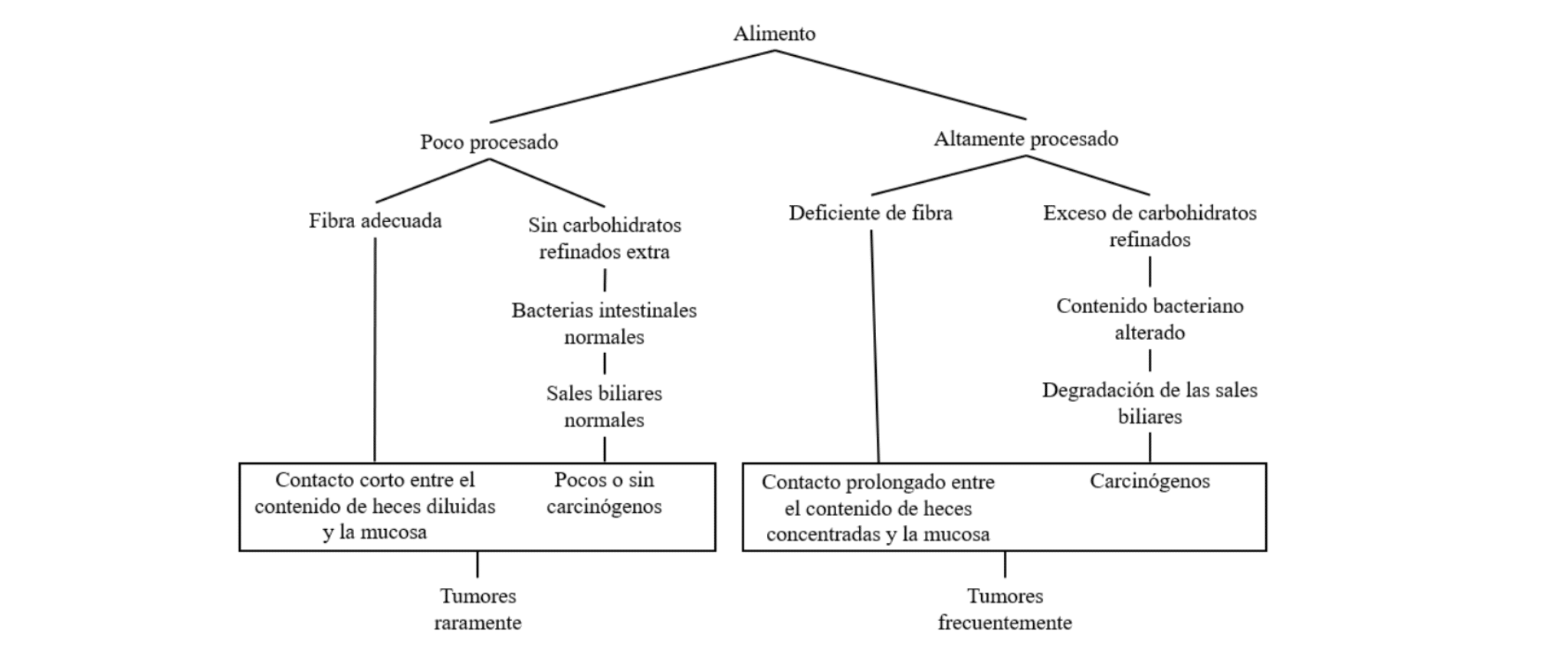 (D) Esquema que hipotetiza la relación entre la alimentación y el cáncer de intestino