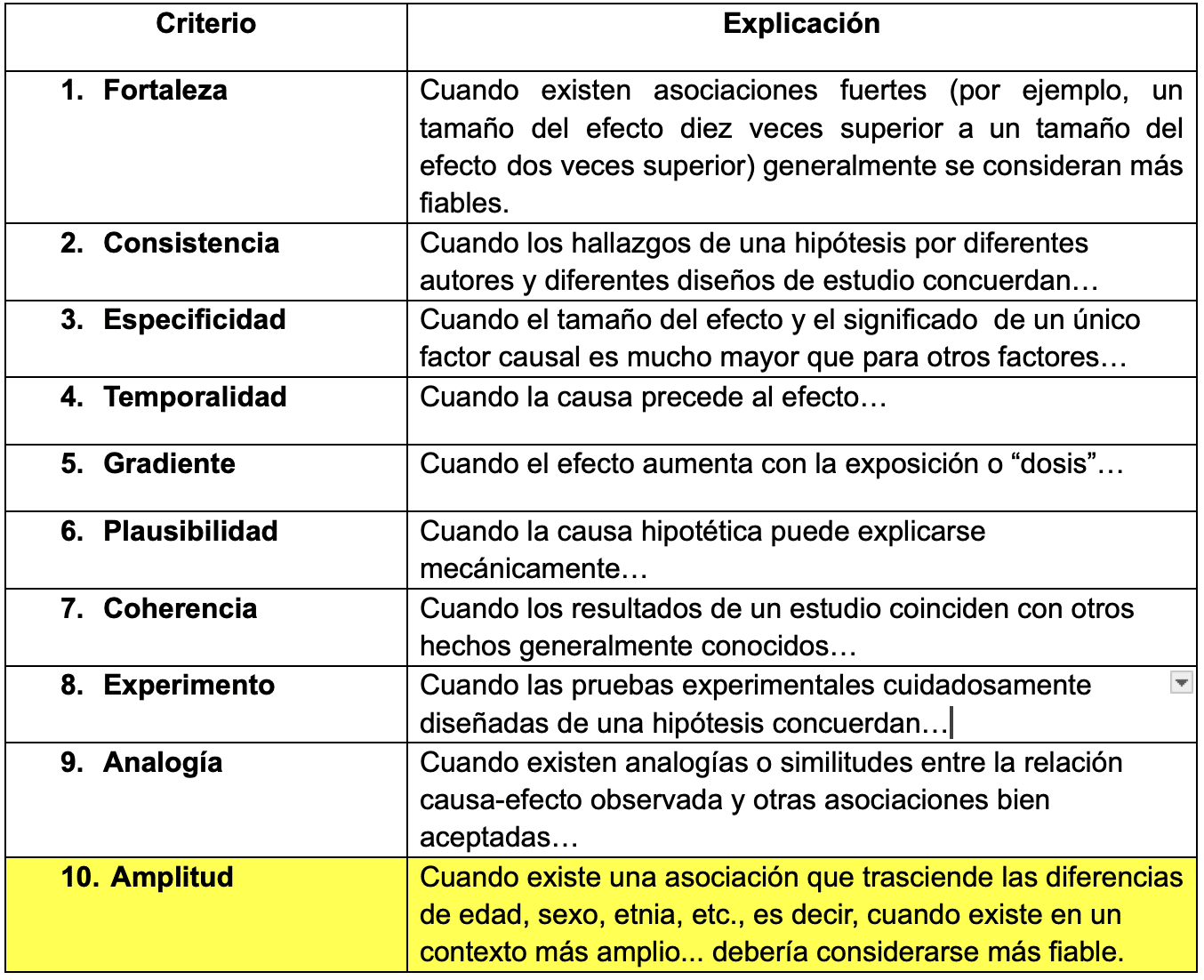 El ‘(w)holismo’ no rechaza los útiles criterios de Hill (a continuación) para la evaluación de las pruebas epidemiológicas. Por el contrario, los celebra y los refuerza añadiendo un nuevo y décimo criterio: la amplitud.