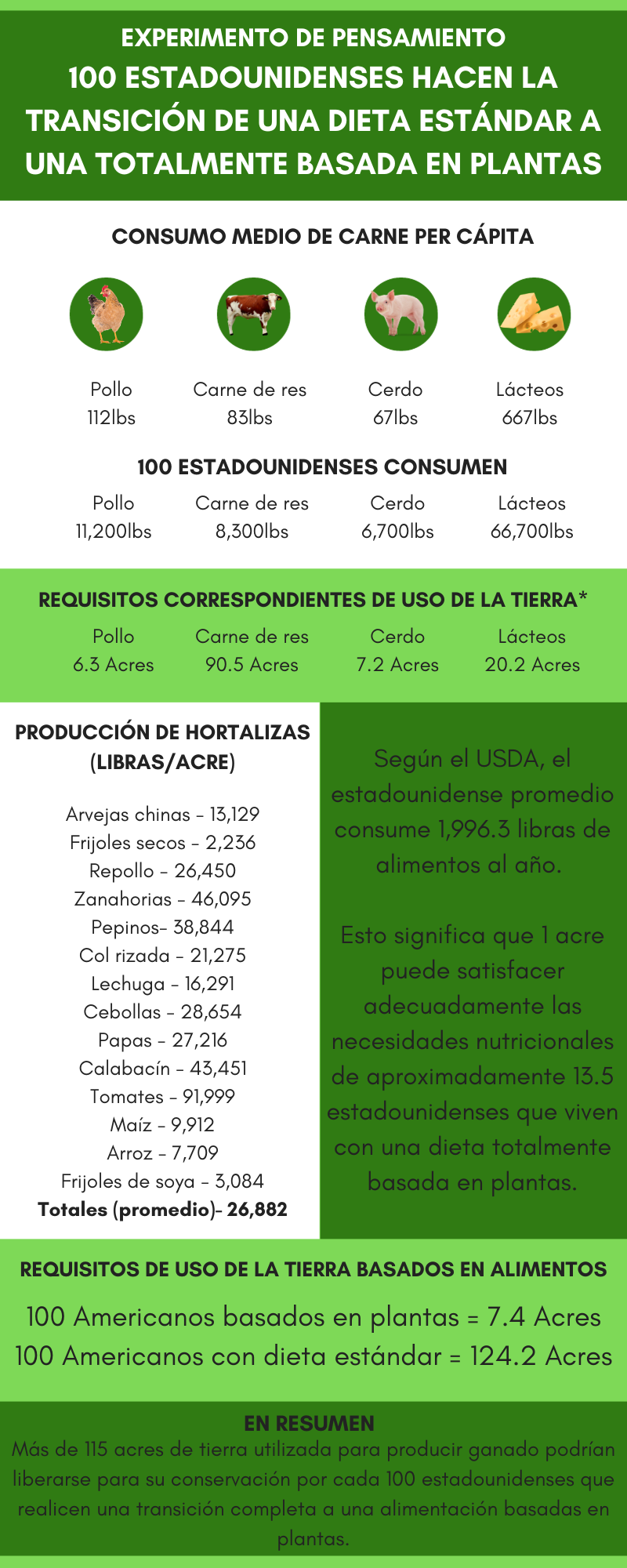 Como experimento mental, supongamos que 100 personas que actualmente siguen la dieta estadounidense estándar cambian a una alimentación totalmente basada en plantas. Sabemos que este cambio tendría un impacto medioambiental, pero ¿cuál sería? Además, ¿cuál es la mejor forma de comunicar el potencial de una transición de este tipo para demostrar el impacto que tendrían estas decisiones en el medio ambiente?