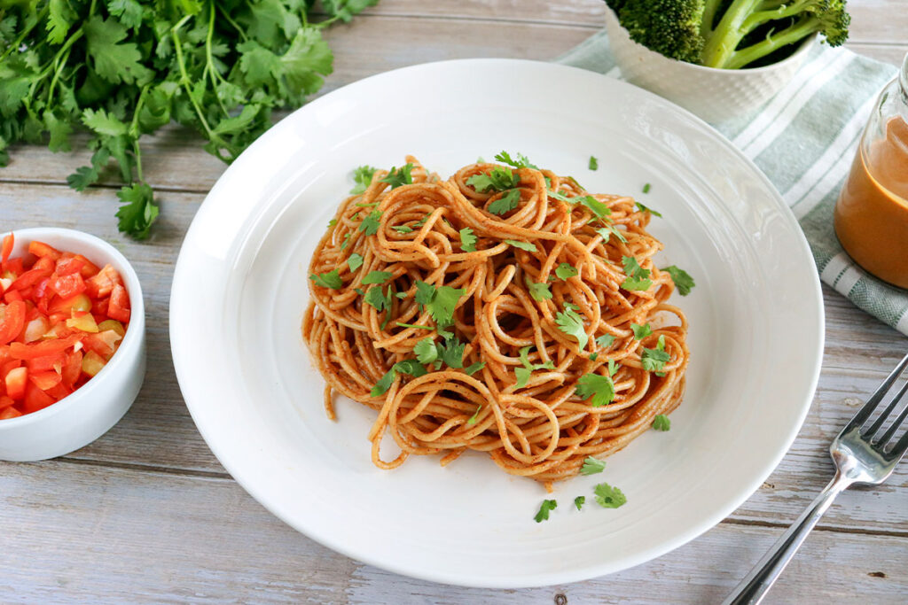 - 2. Mientras los espaguetis se cocinan, combina la mantequilla de la almendra, el agua, el vinagre del arroz, la salsa de soya o el tamari y la pasta de curry rojo tailandés en un recipiente grande y mezcla todo.