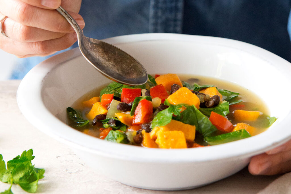 - 1. En una olla grande, sofríe las cebollas y los pimientos morrones en caldo vegetal a fuego medio-alto hasta que se doren. Agrega el comino y el curry en polvo y cocina de 1 a 2 minutos.
