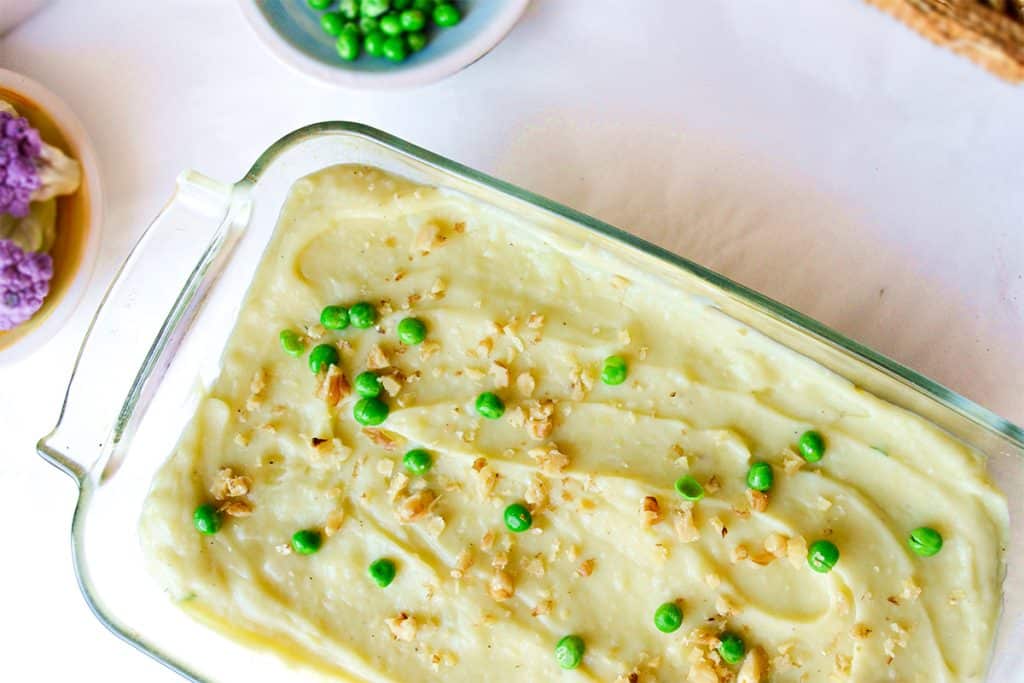 - 8. Add the Vegan Mashed Potatoes and spread evenly across the top of the lentil mixture.