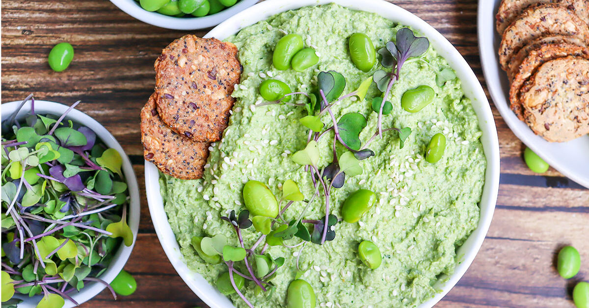 Edamame makes a very smooth and delicious hummus that’s a great alternative to the traditional chickpea recipe. It has a faint sweetness and a slightly nutty flavor that goes really well with whole wheat pita or your favorite dipping snack.