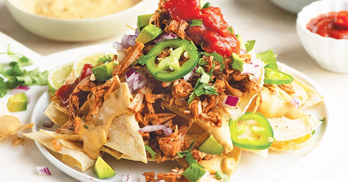 Loaded nachos are the ultimate game-day appetizer for sharing with family and friends. These crispy oil-free corn tortillas are piled high with BBQ jackfruit, vegan nacho sauce, and of course, an assortment of veggie toppings. You can customize this recipe with all the toppings your family loves.