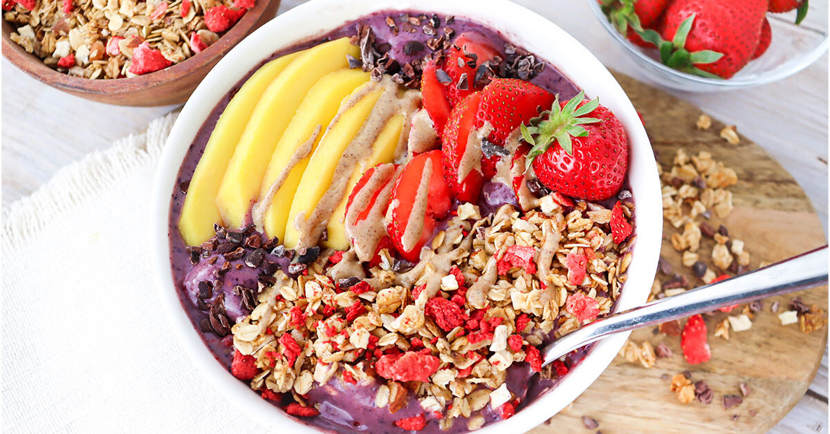 This sweet-tart açaí smoothie bowl is delicious! Topped with fresh fruit, homemade granola, cacao nibs, and almond butter, it makes for a delicious breakfast, snack, or treat.