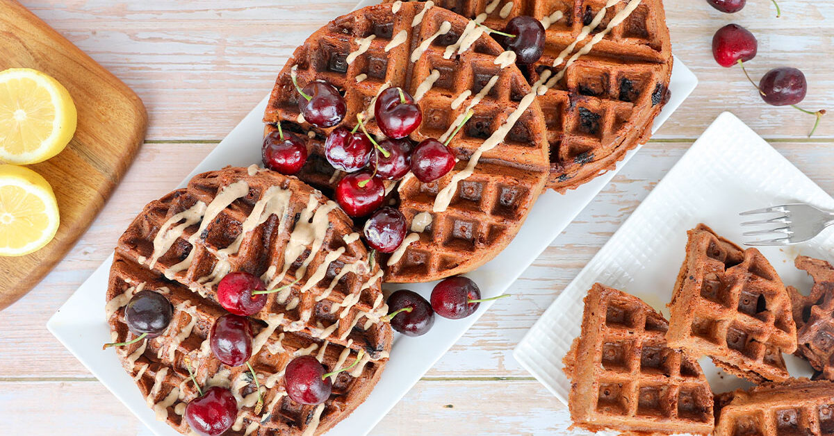 These gluten-free plant-based waffles have a harmonious blend of flavors and textures—perfect for your next breakfast or brunch! The invigorating fusion of cherries and lemon will whisk your taste buds away on an enchanting and irresistible adventure.