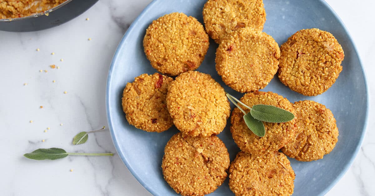 These flavorful and nutritious patties pack a variety of aromatic herbs and spices—a delightful alternative to traditional meat-based sausages! And because they’re made with millet, they are also the perfect choice for anyone on a gluten-free diet.