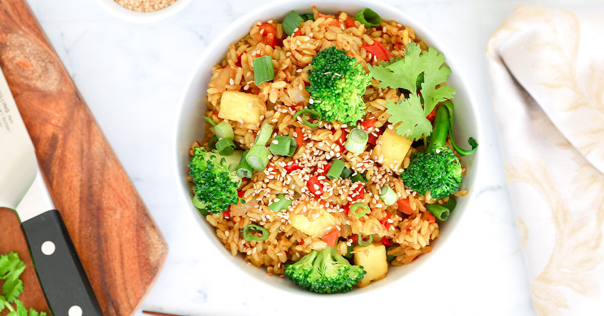 This plant-based fried rice recipe is oil-free and easy to follow. You can prepare it in under 30 minutes, making it perfect for a quick, tasty weeknight dinner incorporating leftover brown rice. The natural sweetness of the vegetables and pineapple pairs beautifully with the savory spices, creating a perfect balance of taste and texture. You can use any vegetables on hand, making this recipe versatile and adaptable to your preferences.