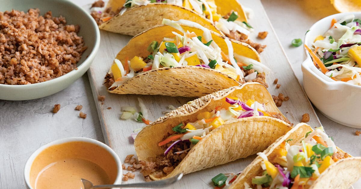 This recipe takes Taco Tuesday to another level. Mexican and Thai come together for a fun and flavor-packed fusion taco. Combining different world cuisines on the same plate is a great way to experiment with spices, flavors, and unfamiliar ingredients. Here, the vibrant flavors, including an array of spices, are infused into the meaty cauliflower and walnut taco filling. The taco is topped with a sweet-and-sour coleslaw and a savory peanut sauce.