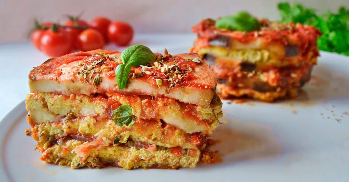 This is a really fun dish to put together and even more fun to eat. Each person gets their own delicious stack of eggplant with vegan ricotta cheese.
