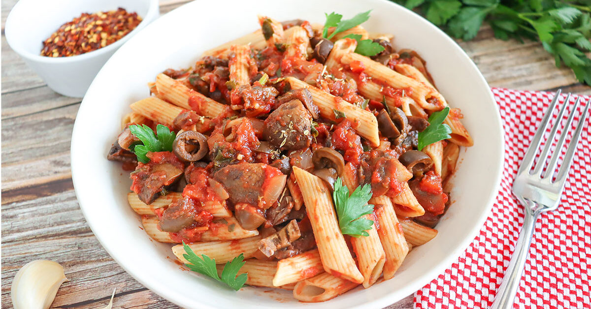 This pasta cacciatore has the wonderful flavors of the classic Italian dish—without meat. The spicy, chunky red sauce is packed with tomatoes, olives, mushrooms, red pepper, and onions.