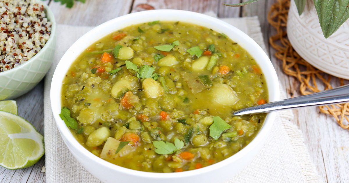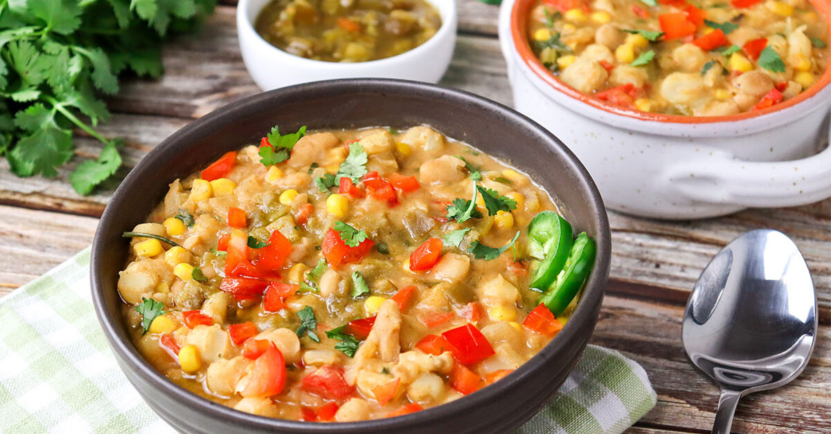 The combination of jackfruit and great northern beans gives this white chili the perfect texture. Seasoned with mild ancho chili powder, green chilies, and ground cumin, it has layers of complex flavors without being overpowering.