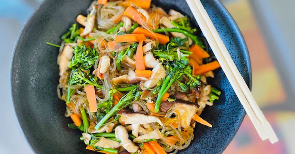 Japchae is a popular Korean dish characterized by sweet potato noodles and a mixture of vegetables. It’s often consumed at celebrations, and as you’ll see with this recipe, it can come together really quickly!