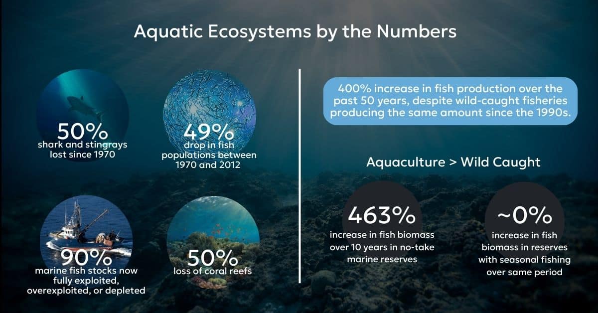 Aquatic ecosystems worldwide are facing severe challenges according to nearly every available metric. Recent reports indicate that shark and stingray populations have been halved since 1970, trends which echo earlier studies showing a 49% decline in fish populations between 1970 and 2012.[1][2] Today, nearly 90% of global marine fish stocks are fully exploited, overexploited, or depleted.[3] In addition, one-third of all marine mammals and reef-forming corals are threatened with extinction globally while more than half of coral reefs have been lost due to climate change.[4][5]