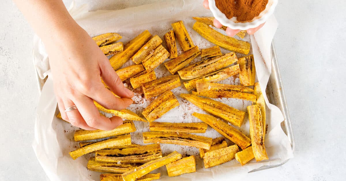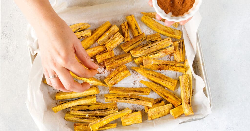 First, preheat your oven to 350 degrees Fahrenheit, then cut off the ends of your plantains. Once you’ve done that, slice through the skin from one end to the other. Make sure you’re only cutting through the skin! Make three cuts like this, along the length of the plantain on each side, and pull off the skin. Once you’ve removed the skin, cut the plantain in half and slice it lengthwise into quarter-inch slices. Place these slices flat on a parchment-lined, non-stick baking sheet. Sprinkle with powdered cinnamon. Bake for 10 minutes. Flip and continue baking for another 10 minutes or until browned. Serve with your favorite dish.