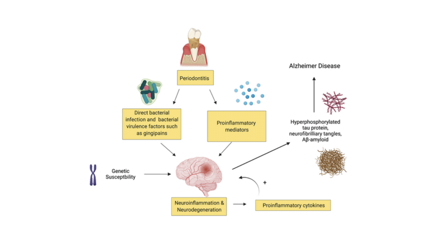 You might think this is because periodontitis and conditions of cognitive impairment share the common underlying factor of chronic inflammation—and you would be right, partly—but there are also mechanisms by which periodontitis itself might lead to increased neuroinflammation and neurodegeneration.[11] In other words, it is not merely that these conditions share a common cause.