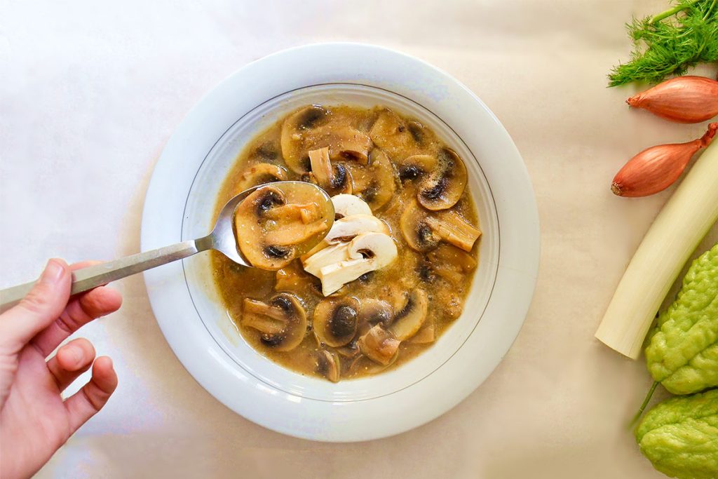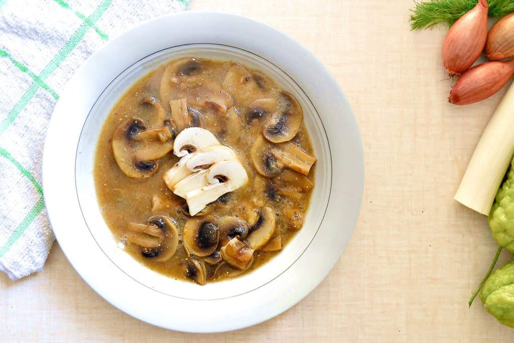 - 3. Add half of the flour-broth mixture, the soy sauce, and the remaining vegetable broth to the mushrooms.