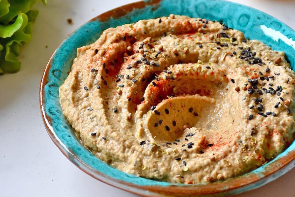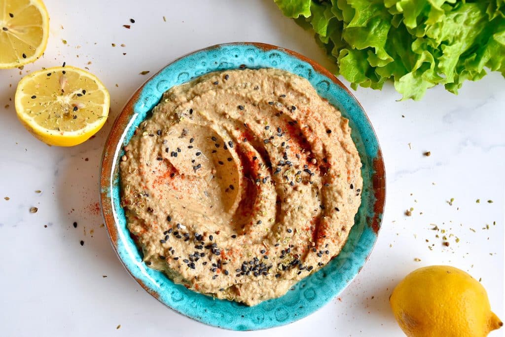 - 3. Meanwhile, in a food processor, combine the water, lemon juice, and tahini until smooth. Add the remaining ingredients, including the cooked eggplant and onion. Blend until smooth.