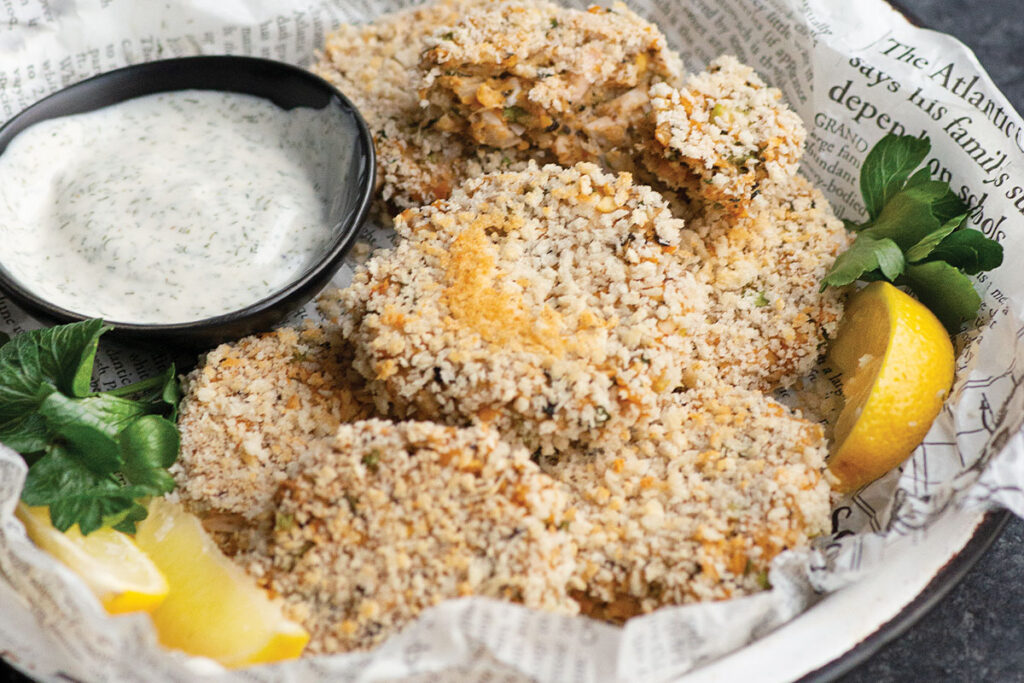 - 6. Put the panko in a shallow bowl. Lightly press each patty into the panko until thoroughly coated. Place the patties on the lined baking sheet and bake for 15–18 minutes or until golden brown. Serve immediately with the aioli.