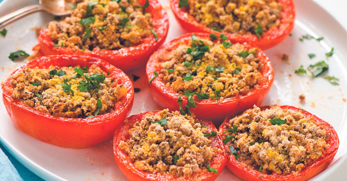 - 6. Place the tomatoes in a non-stick baking dish, cut side up. Fill each tomato with some of the quinoa filling; then, top each tomato with a few tablespoons of the bread crumb mixture.