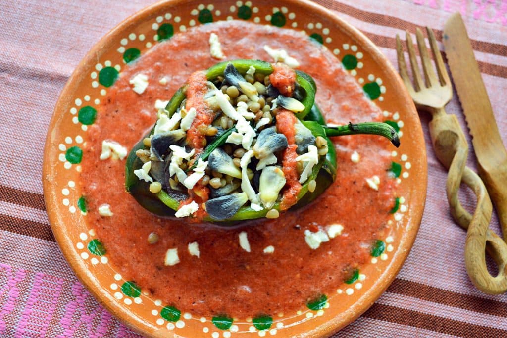 - 5. Stuff the poblano chiles with the huitlacoche and lentil mixture. Serve on large plates with a base of sauce.