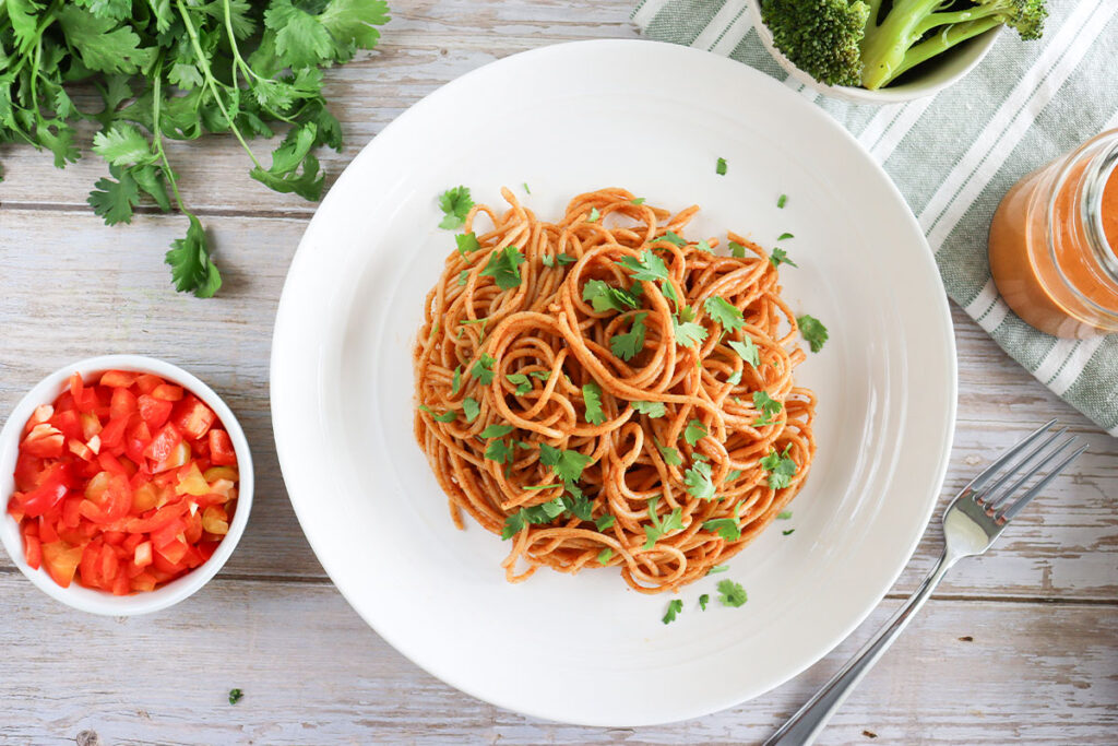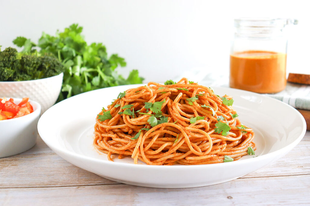 - 2. While the spaghetti cooks, combine the almond butter, water, rice vinegar, soy sauce or tamari, and Thai red curry paste in a large bowl and whisk together.
