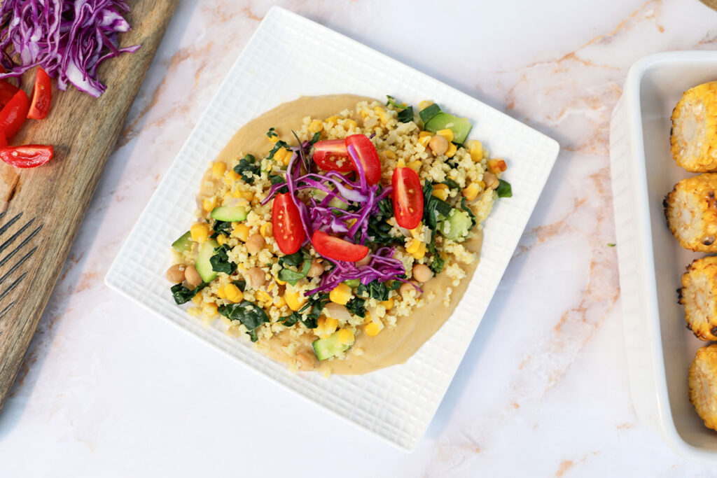 - 6. Spread the chickpea sauce on a plate and top with the hot millet mixture. Season with salt and crushed red pepper (if using), garnish, and serve.