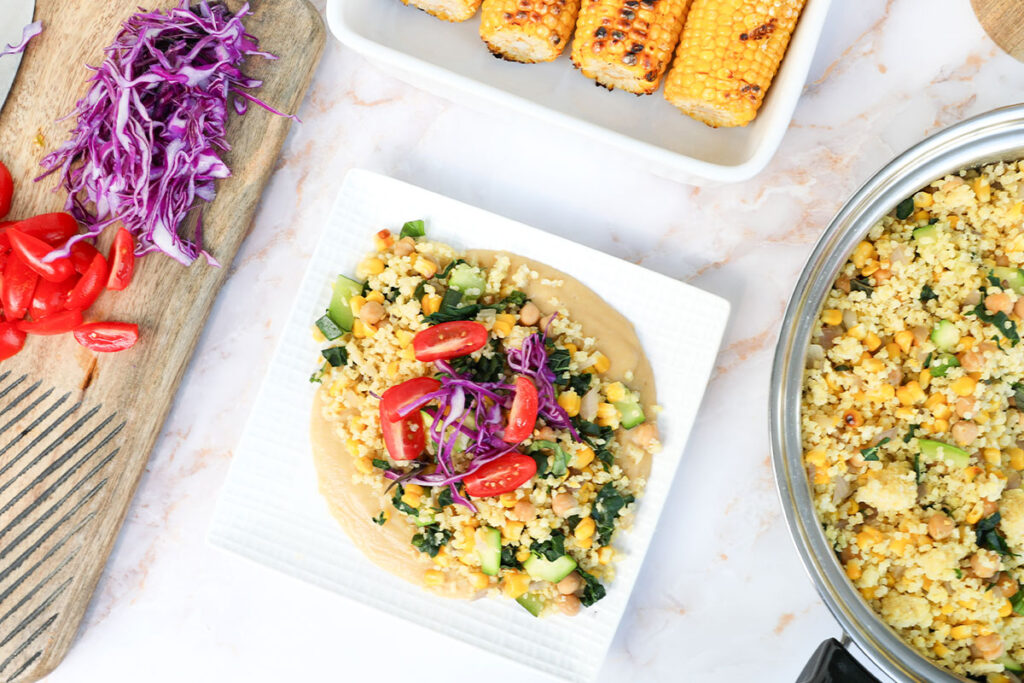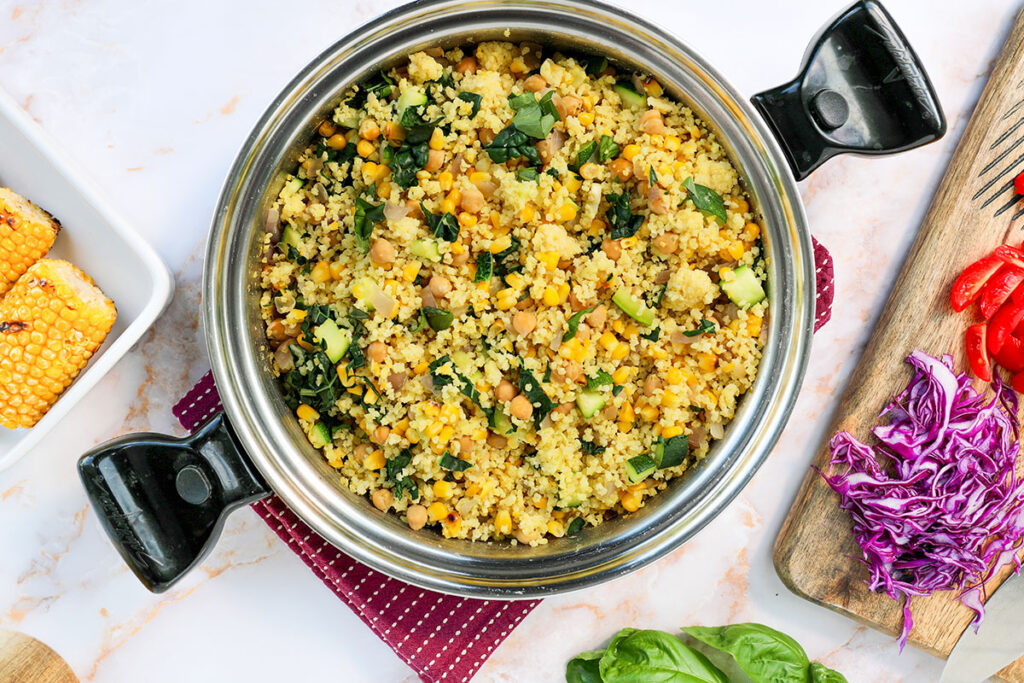 - 5. Stir in the corn, kale, chickpeas, cooked millet, basil, and seasoning. Continue to cook for about 2 minutes, or until hot.