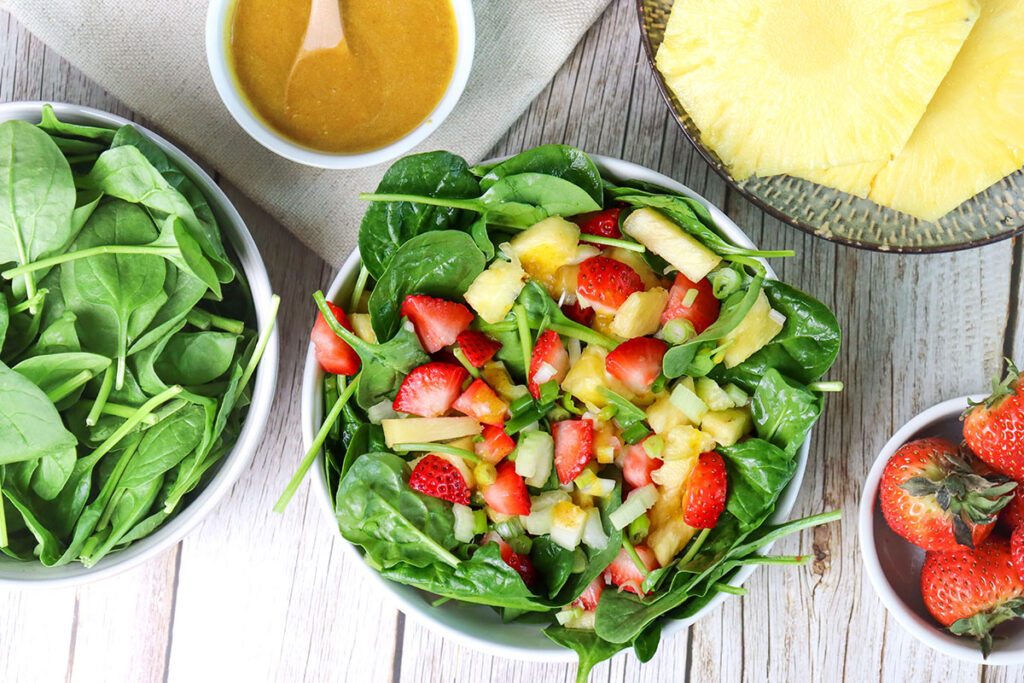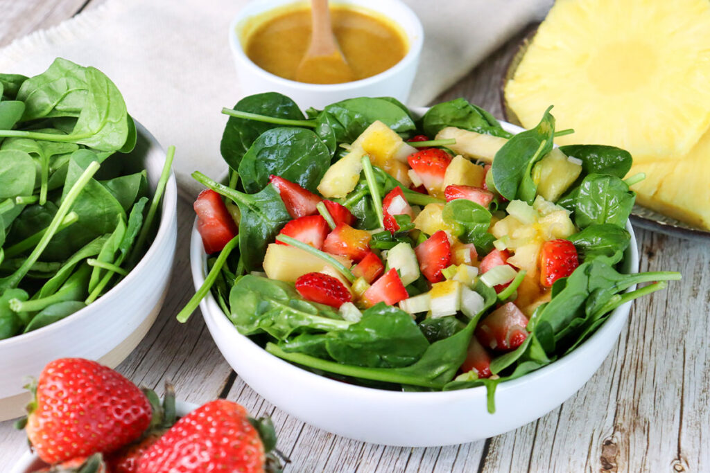 - 1. In a large salad bowl, combine the spinach with the pineapple, strawberry, and scallions. Add the sesame seeds (if using).