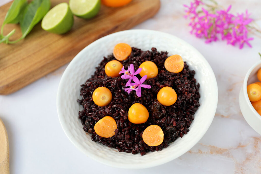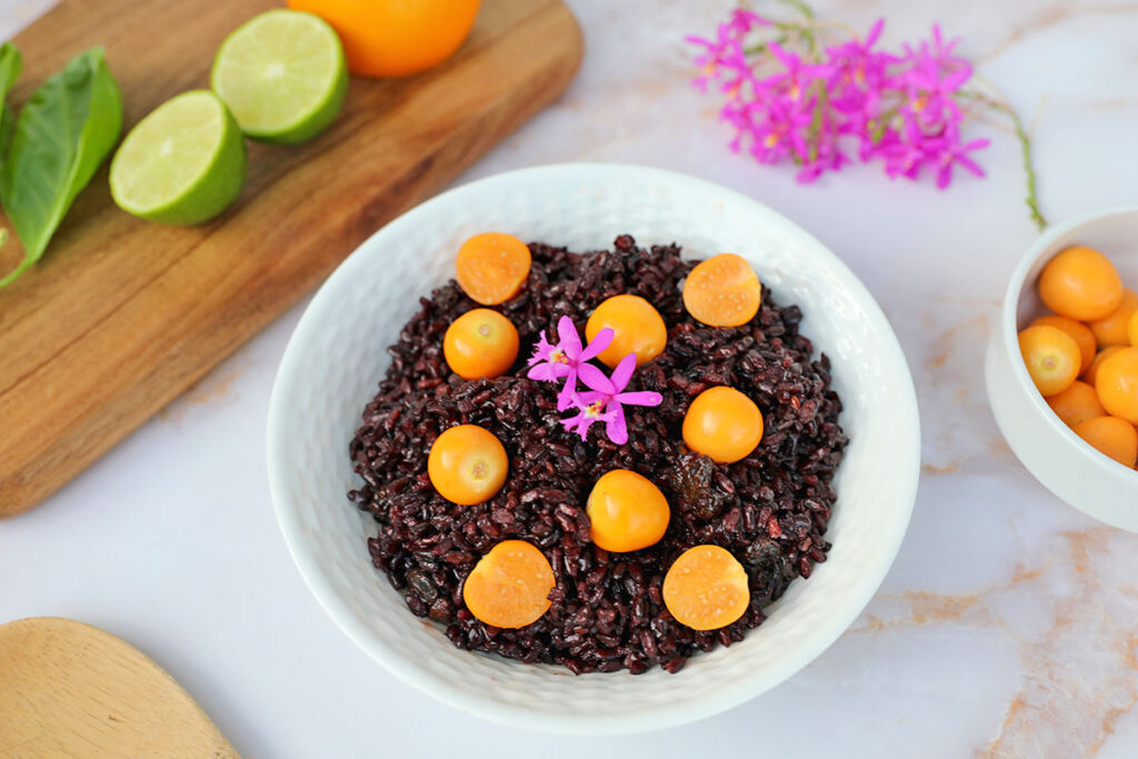 Author’s notes: When I spotted red raisins in the supermarket, I instantly knew what I wanted to do with them: throw them into a bowl of black rice together with cape gooseberries.