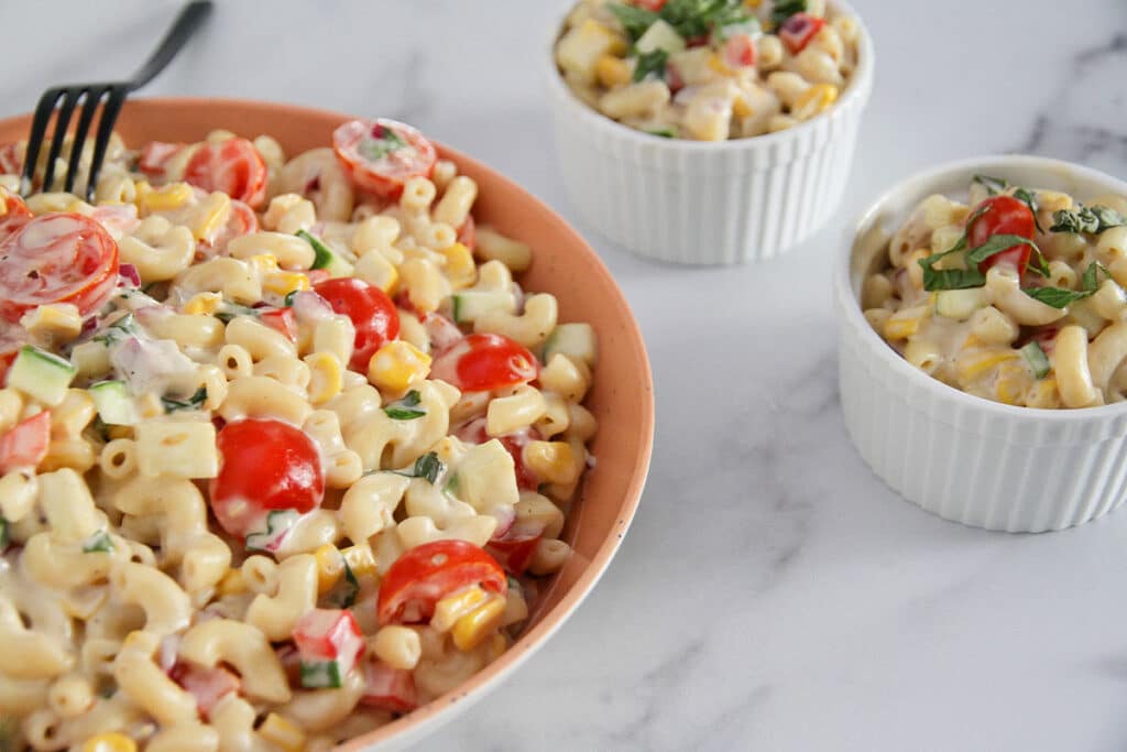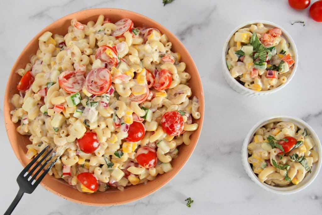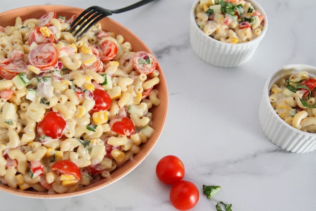 - 2. In a large bowl, combine the macaroni with the red bell pepper, red onion, zucchini, yellow squash, cherry tomatoes, corn, mayonnaise, fresh basil, Dijon mustard, sea salt, and black pepper.