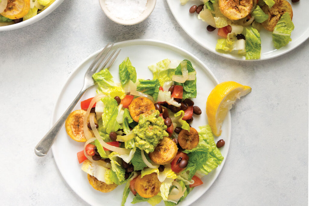 Author’s note: Baked sweet plantains sprinkled with cinnamon are a wonderful addition to any salad green salads, especially when prepared with tomatoes, onions, black beans, and guacamole. I generally like this salad without dressing, but I do squeeze a bit of lemon juice on top.
