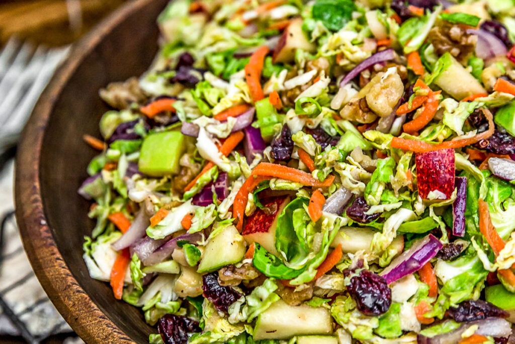 - 4. Add the carrots, onions, apples, toasted walnuts, and dried cranberries to the bowl with the Brussels sprouts. Gently toss.