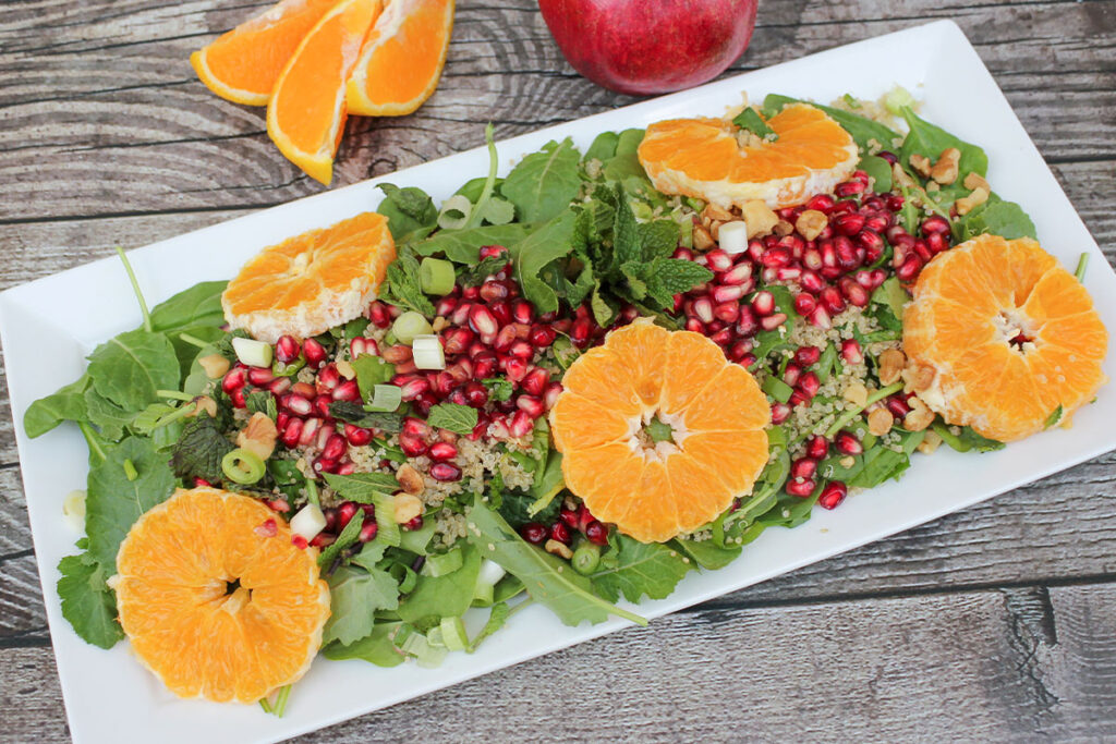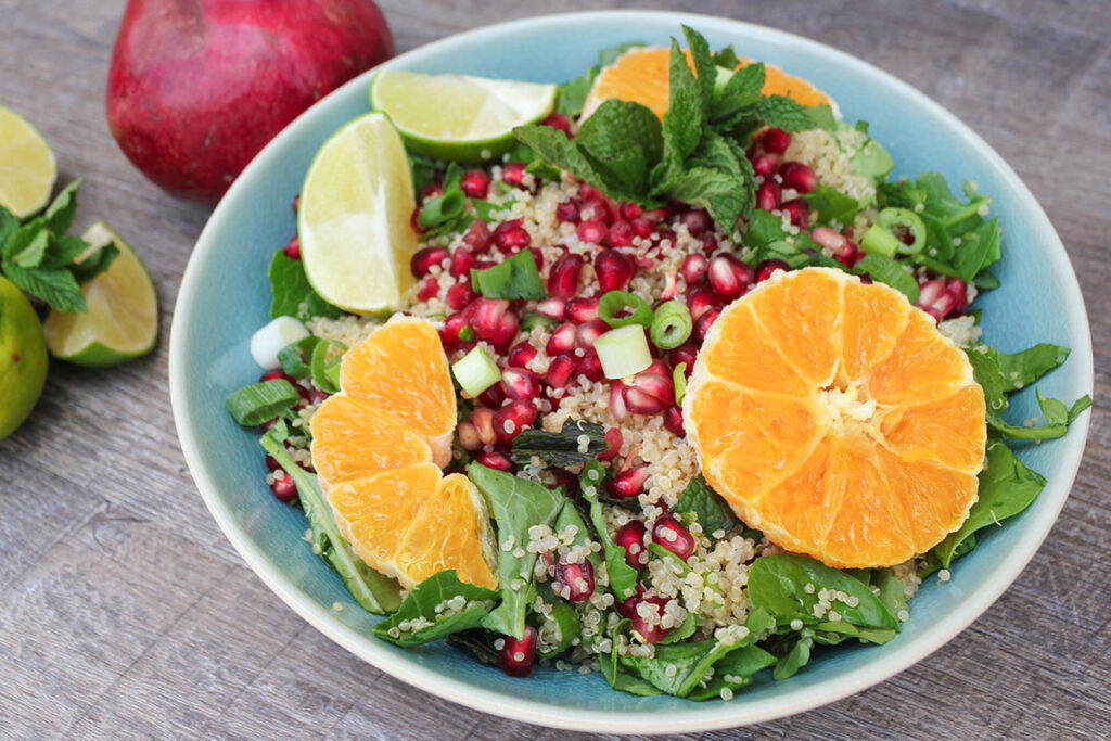 - 1. In a large bowl, stir in spinach, kale, mint, quinoa, lime zest, and green onion. Top with pomegranates, orange slices, and walnuts.